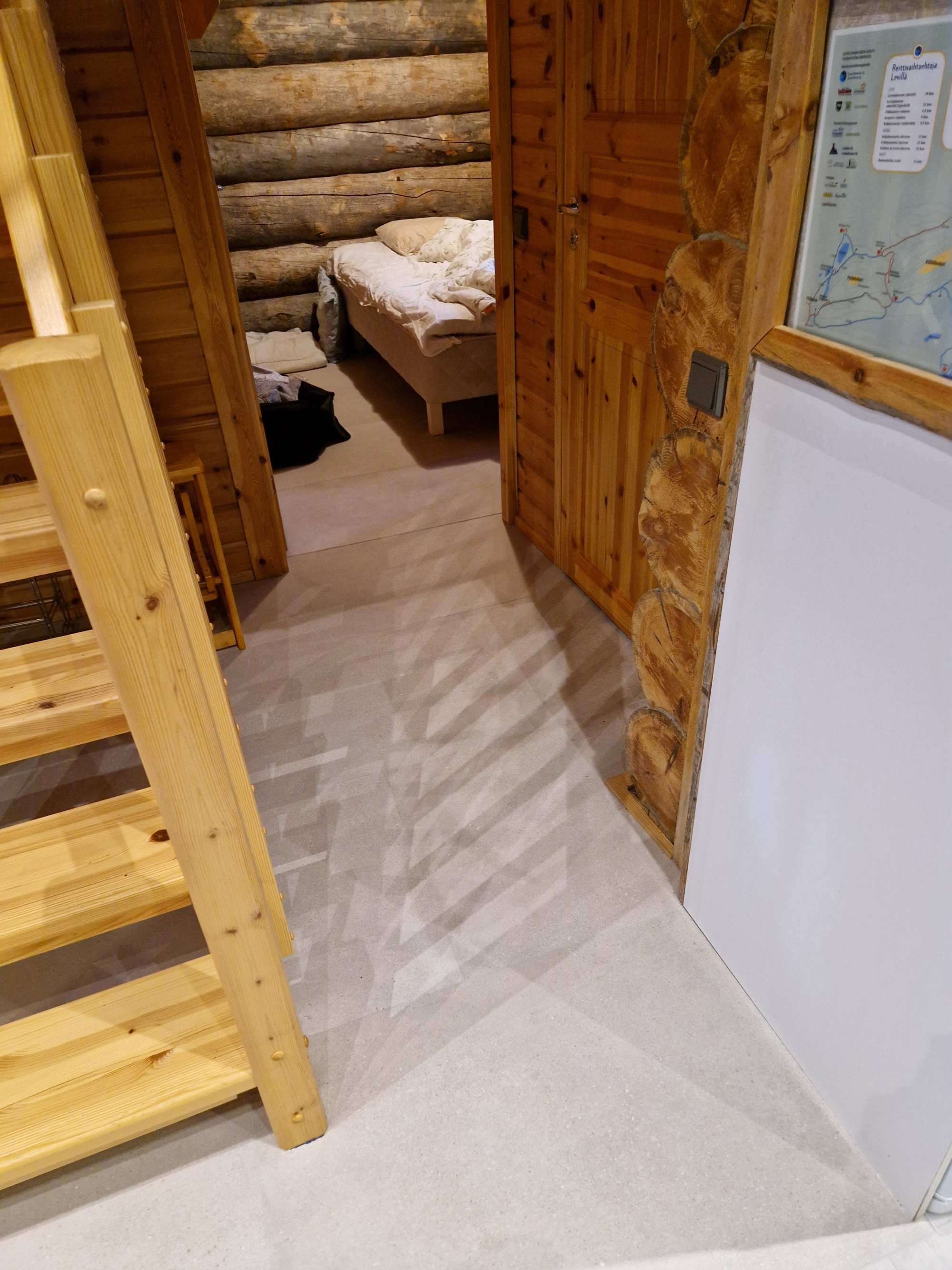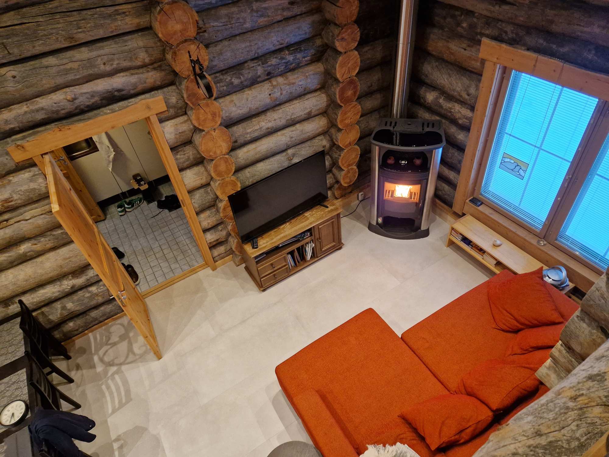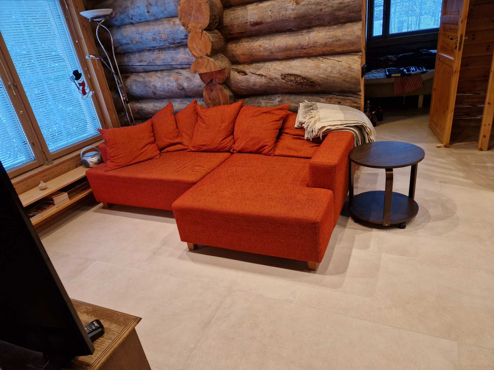 | Olohuoneen lattiamateriaali | Laatta ja lattialämmitys, pellettitakka |