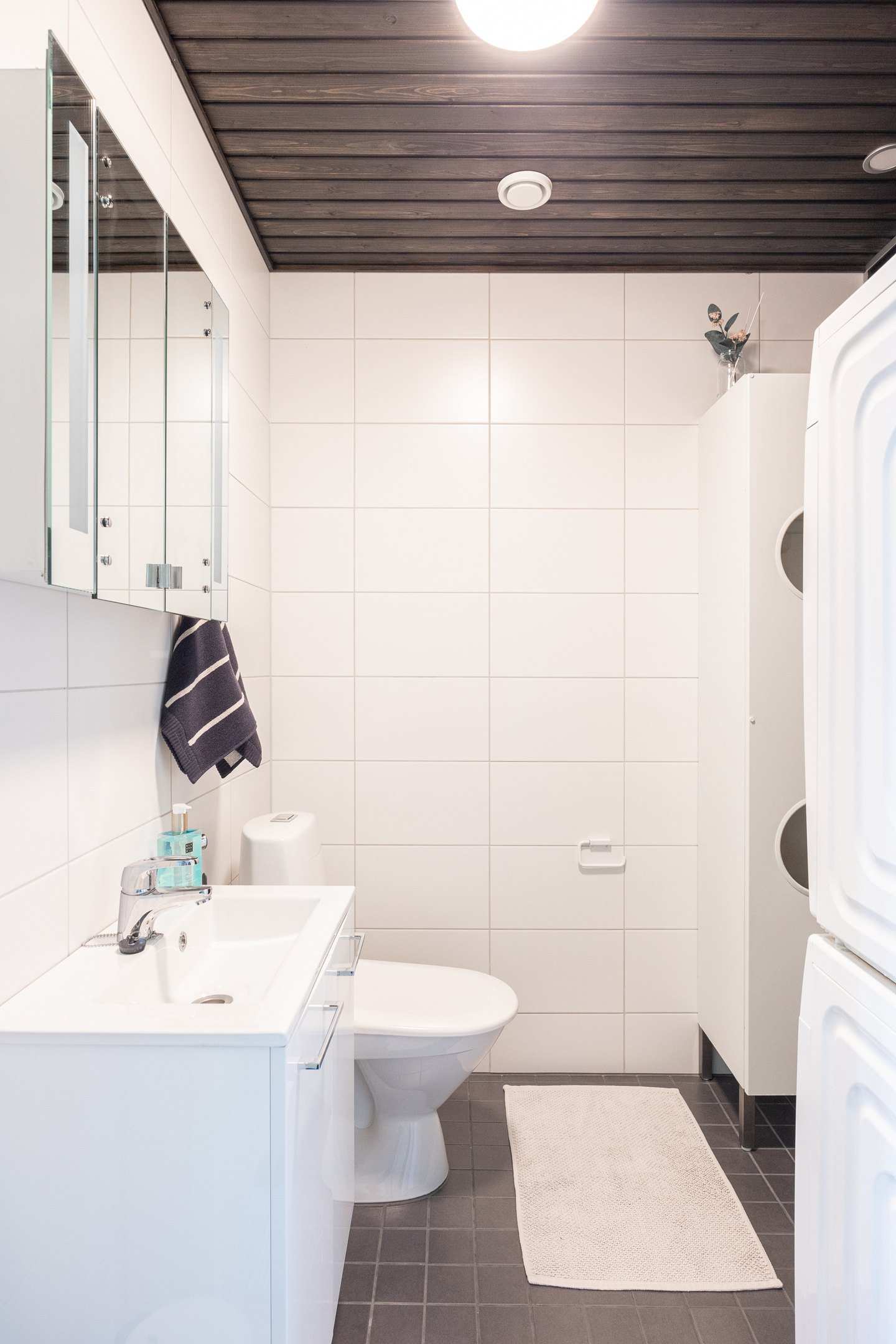 Kylpyhuone | Suihku, pesukoneliitäntä. Lattia ja seinät laatoitettu. |