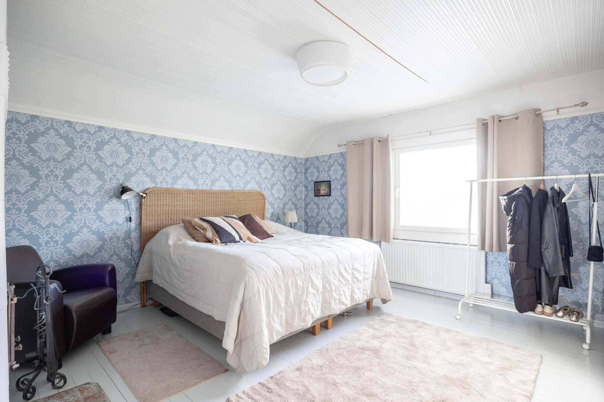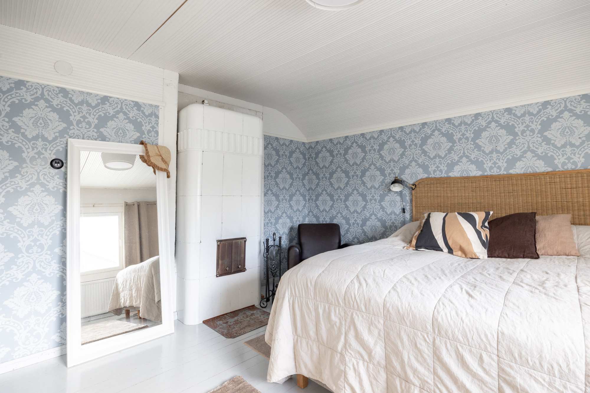 Makuuhuone | Alakerran makuuhuoneessa liuskekivitakka ja yläkerran isommassa makuuhuoneessa kaakeliuuni |