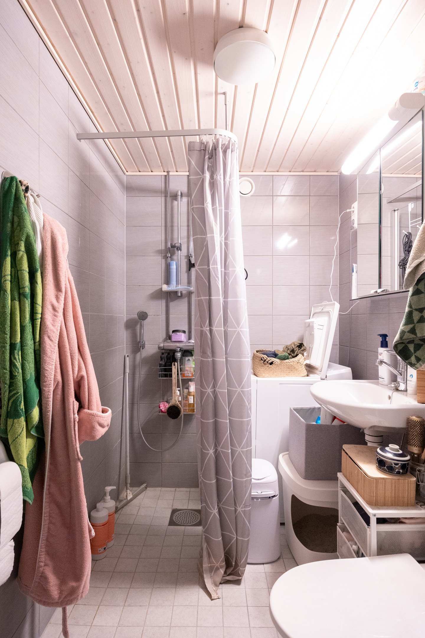 | Kylpyhuoneen varusteet | Lattialämmitys (sähkötoiminen mukavuuslämmitys), wc-istuin, suihku, pesukoneliitäntä, peilikaappi, suihkuseinä ja pesuallas |