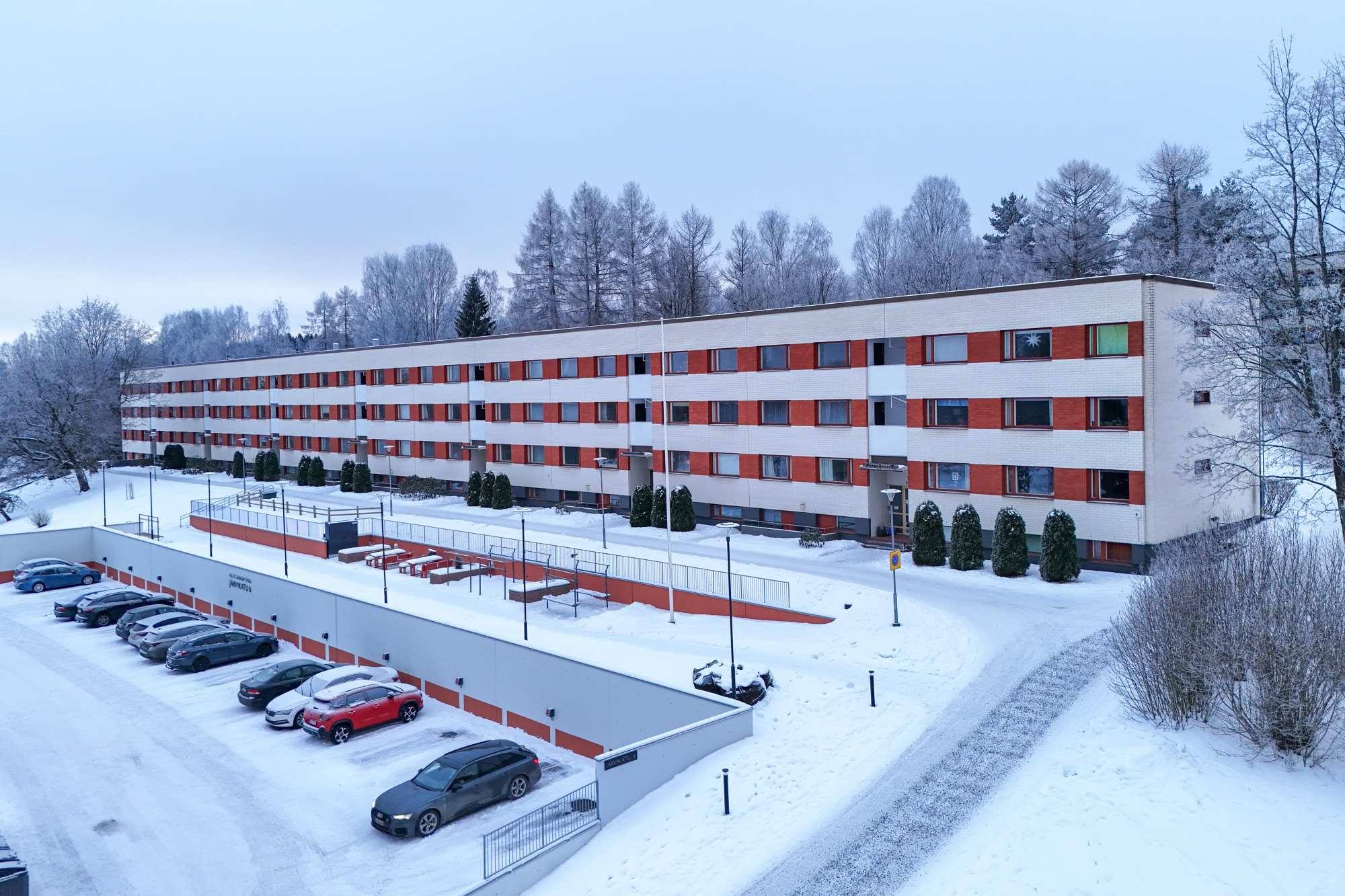| Tehdyt korjaukset ja remontit | 1997 Talon länsipääty on korjattu. 2000 Porrashuoneiden ulko-ovien uusiminen. 2003 Lämmönsiirtimien, patteriventtiilien- ja termostaattien uusinta 2003 Lämmitysverkoston tasapainotus ja pesu 2005 Julkisivujen peruskorjaus valmistunut 9/2005. Sisältää uudet oleskeluparvekkeet, uudet huoneistojen ikkunat sekä julkisivun lisäeristyksen ja muurauksen. 2009 Rakennuksen vesikatto uusittu 10/2009 (parvekekatot ja sisäänkäyntilipat tehty 9/2005) 2011 Ilmanvaihtojärjestelmä nuohottu ja säädetty 2011 Vesi- ja viemäriputket uusittu 2011 Märkätilat ja sähköjärjestelmä peruskorjattu 2011 Linjasaneeraus sisältäen mm.: vesijohdot uusittu, viemärit uusittu, huoneistojen märkätilat korjattu, huoneistoihin sähköjen nousujohdot sekä huoneistojen ryhmäkeskukset uusittu ja muilta osin tehty sähkösuunnitelman mukaisesti, huoneistoihin asennettu huoneistokohtaiset vesimittarit, kylmiö peruskorjattu, taloyhtiön saunaosastot peruskorjattu, Linjasaneeraus valmis 09/2011. 2012 Yhtiön lukitus uusittu ILOQ-järjestelmään 2013 Etupihan viheralueen istutukset 2016 Uusittu tuuletusparvekkeiden ovet ja G- ja A- päätyjen varastojen ulko-ovet. 2018 Porraskäytävien huoltomaalaus 2018 IV-kanavat nuohottu 2018 Viheristutuksia lisätty 2019 Löylyhuoneen paneelit uusittu 2020 Sokkelit ja alakerran ikkunat ja ovet huoltomaalattu 2022 Kerrostaso-ovet uusittu ja lukitukset siirretty heloituksineen uusiin oviin 2022 Porraskäytävän valaisimet uusittu liiketunnistinvaloiksi 2023 Kerrostaso-ovien uusinta 2023 Taloautomaation alakeskus, uusinta 2023 Autotallin purku ja pihapaikkojen teko (e-Tolppa) 2023 Jätehuollon päivitys, Molok 2024 Itäpäädyn ilmanvaihtokoneen uusinta 2025 Palovaroittimet taloyhtiöön 2025 Rännit ja kattoturvatuotteet 2025 Savunpoistoikkunan tiivistys 2025 Lämmönsiirrin ja patteriventtiilit uusinta, verkoston tasapainotus |